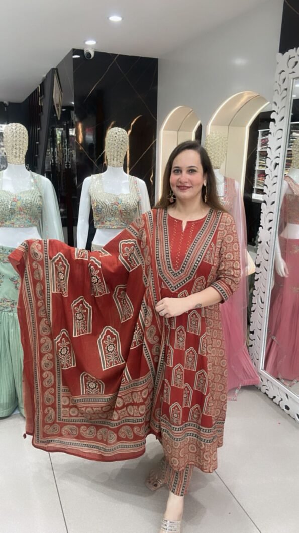 A beautiful terracotta or rust-red color. It is a three-piece suit featuring intricate block or ethnic printing in a lighter, contrasting shade