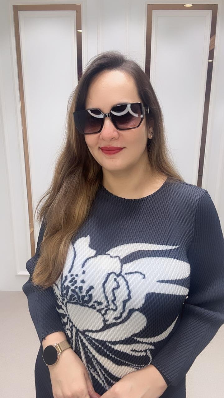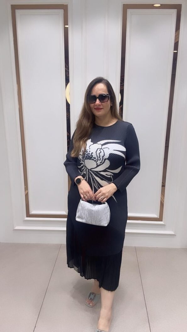 The dress is predominantly black, serving as a backdrop for a large, striking floral design, in shades of white color, positioned on the upper part of the dress.It features a comfortable, loose-fitting silhouette through the body, enhanced by the distinct pleated texture that extends down to the hem, The dress falls to a midi length, reaching around the calves, and has three-quarter length sleeves