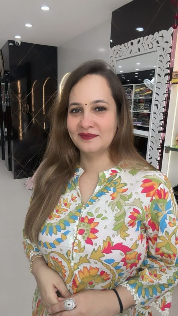 A vibrant and eye-catching ensemble that beautifully combines colors and patterns. The tunic is adorned with intricate floral designs in a mix of bright hues, including pink, green, and yellow, creating a lively and cheerful look.