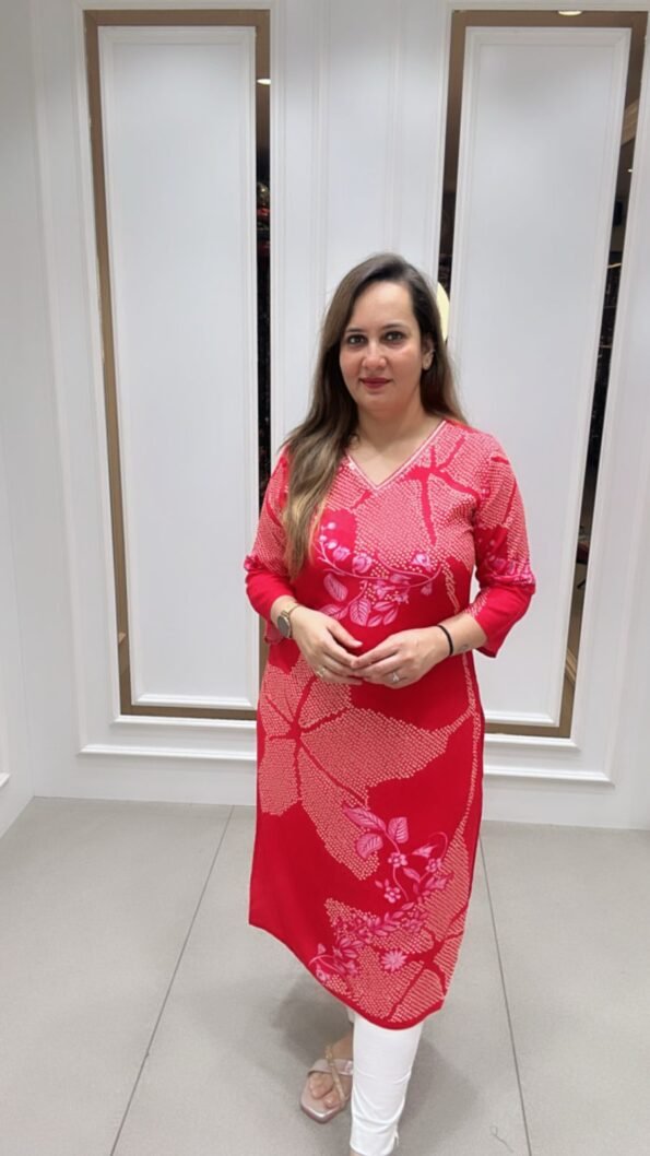 A vibrant red kurta with striking white abstract patterns. It has a relaxed fit with three-quarter sleeves and a V-neckline, creating a stylish and modern look. This outfit combines contemporary design with a bold color, making it suitable for various casual or festive occasions. The unique patterns add an artistic touch to the ensemble.